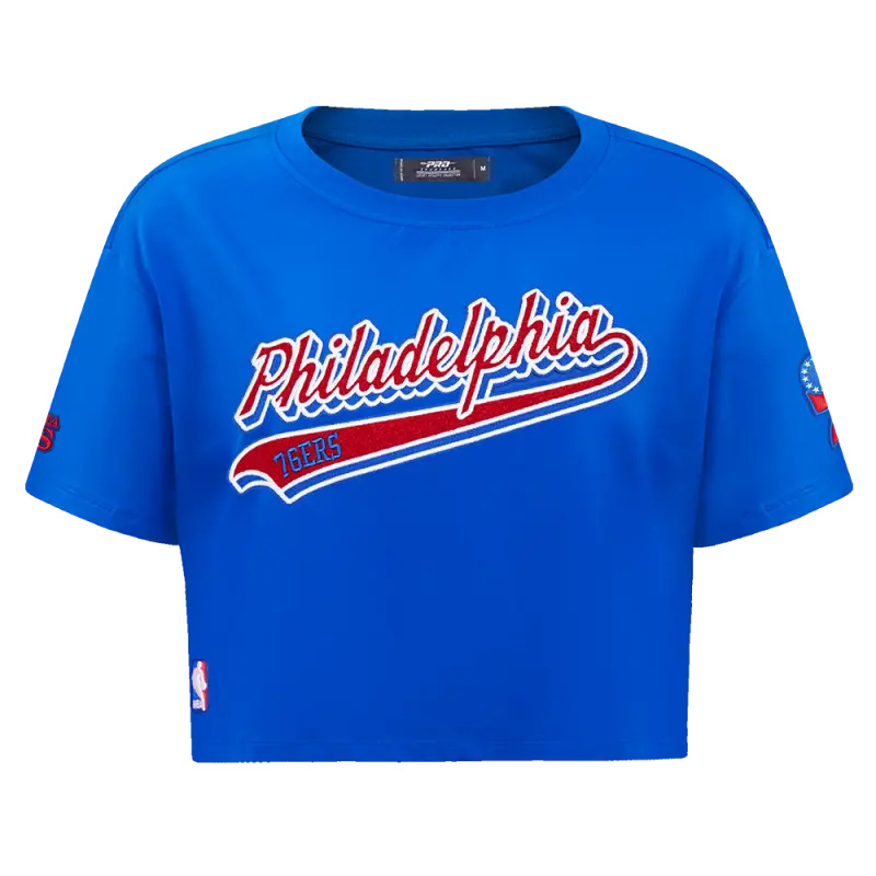 NBA PHILADELPHIA 76ers SCRIPT TAIL WOMEN’S SINGLE JERSEY BOXY TEE (ROYAL BLUE)