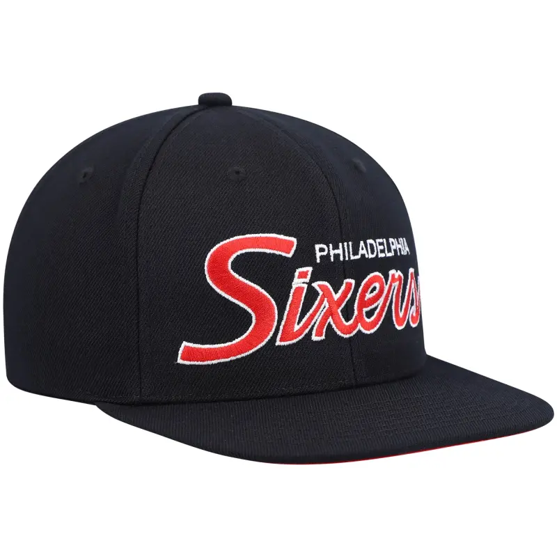 - Put your Philadelphia 76ers fandom on full display with this Hardwood Classics Script 2.0 Snapback Hat from Mitchell & Ness. The adjustable snap closure and structured design provide a reliable fit every time. Vintage Philadelphia 76ers script embroidered across the front of the hat emphasizes your unwavering loyalty.
