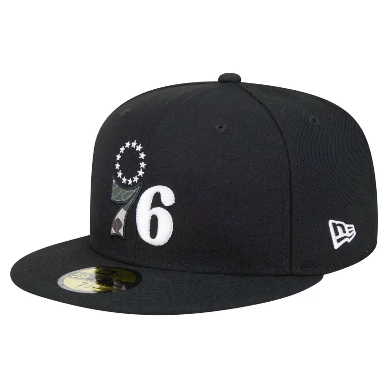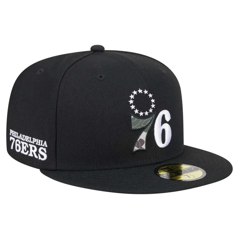 - Show off your Philadelphia 76ers pride in this Camo Print UV 59FIFTY Fitted Hat from New Era. This hat features a striking embroidered team graphic with a tonal camo print on solid front panels, offering a modern and stylish take on classic team gear. The structured fit and high crown provide a comfortable and flattering look, making it a standout piece for any Philadelphia 76ers fan.