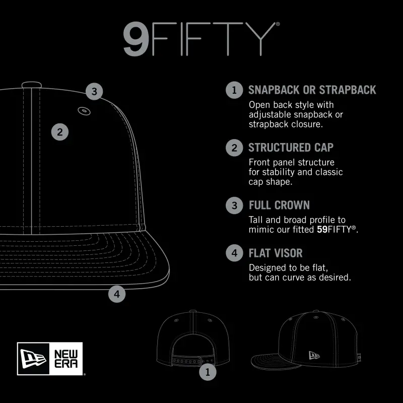- The 9FIFTY is New Era’s classic snapback style, with the same shape as the 59FIFTY but an open back and an adjustable snapback closure