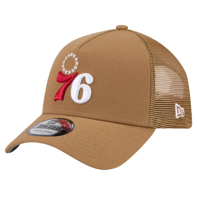 Home / Shop / Philadelphia 76ers / Men’s Philadelphia 76ers New Era Tan 9FORTY A-Frame Trucker Adjustable Hat