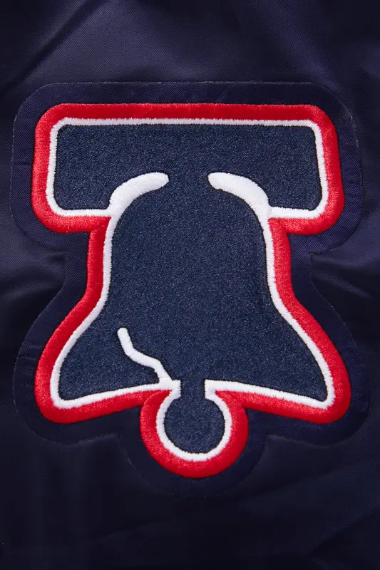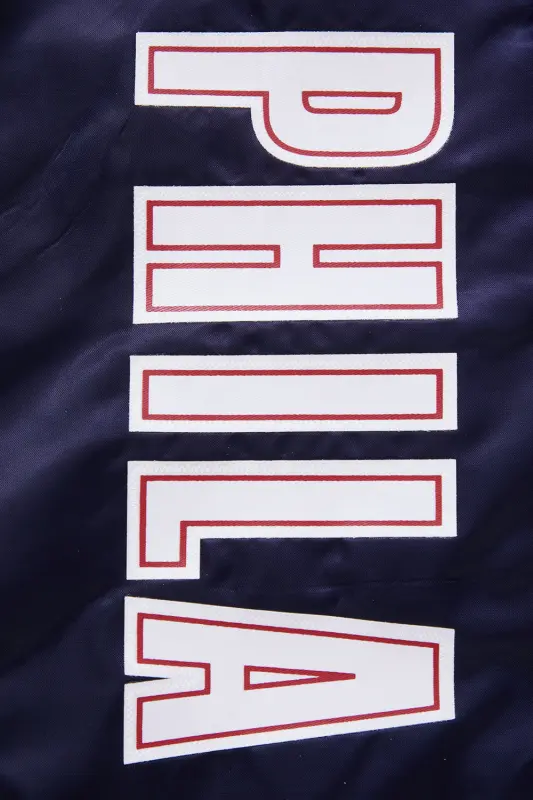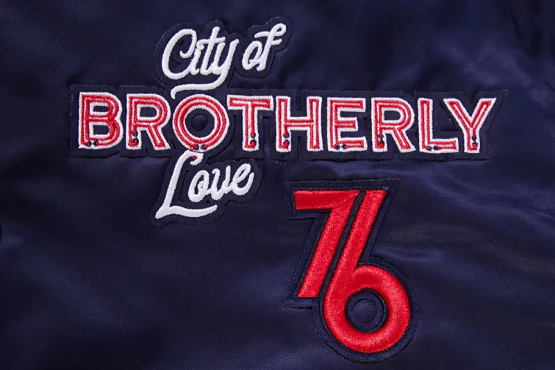 NBA PHILADELPHIA 76ERS CHEST CITY OF BROTHERLY LOVE MEN’S RIB SATIN JACKE (MIDNIGHT NAVY\/RED\/MIDNIGHT NAVY)