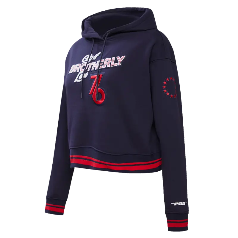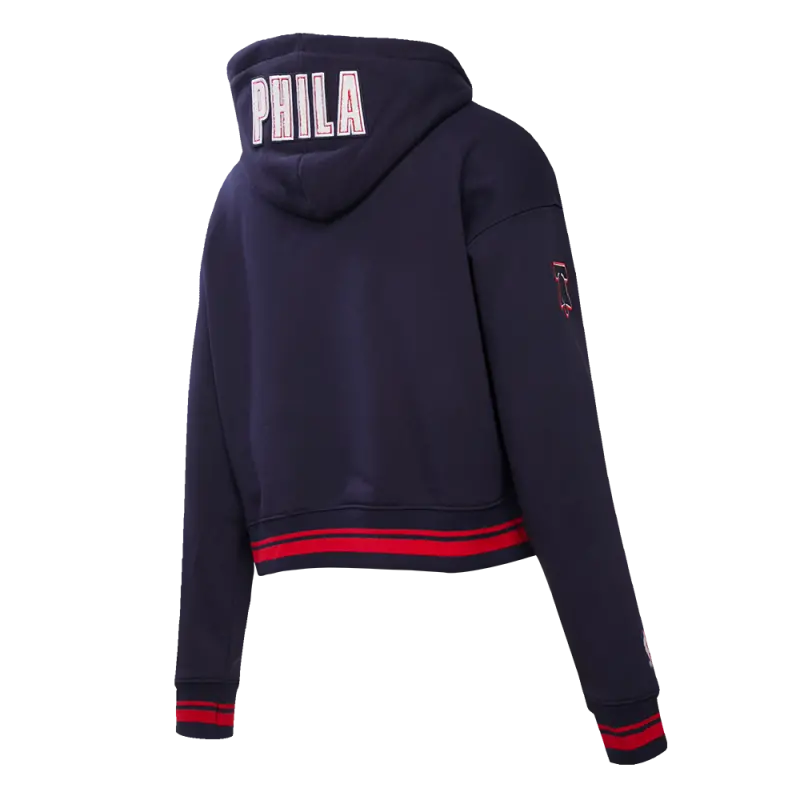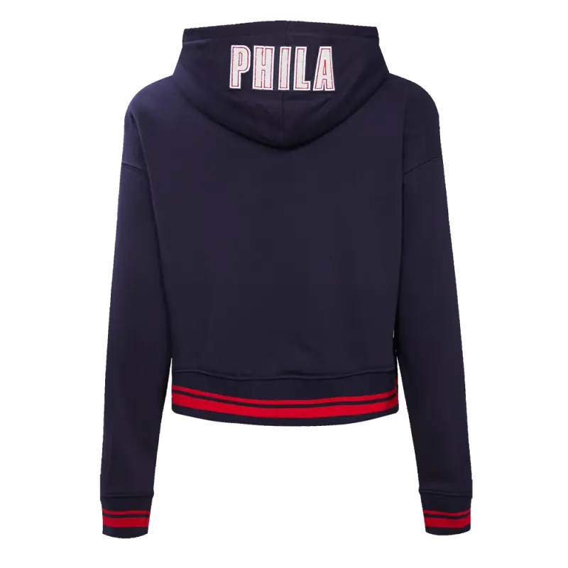 NBA PHILADELPHIA 76ERS CHEST CITY OF BROTHERLY LOVE WOMEN’S RIB CROPPED PULLOVER HOODIE (MIDNIGHT NAVY\/RED\/MIDNIGHT NAVY)