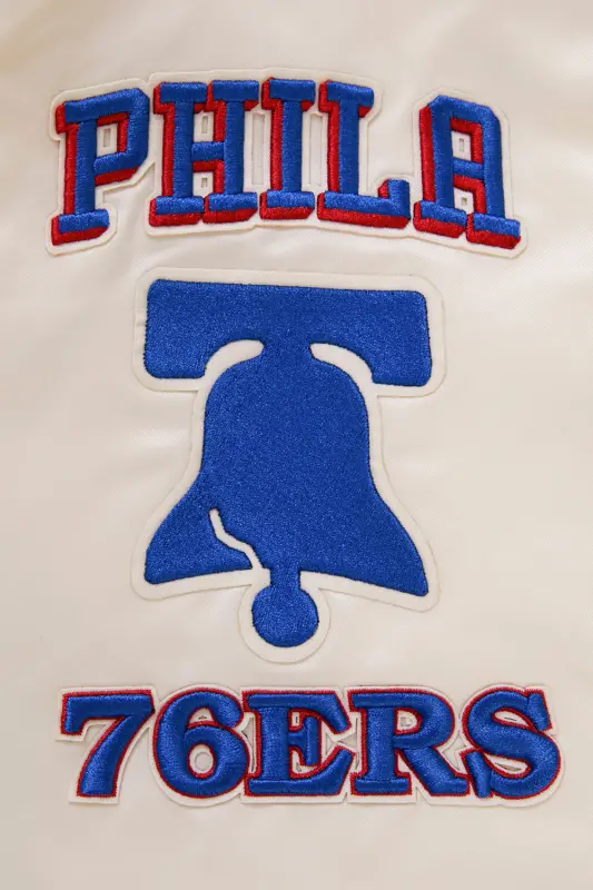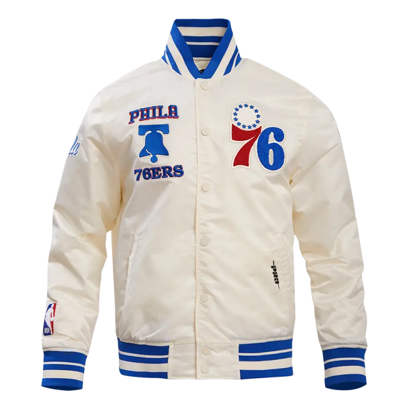 NBA PHILADELPHIA 76ERS RETRO CLASSIC MEN’S RIB SATIN JACKET (EGGSHELL\/ ROYAL BLUE)