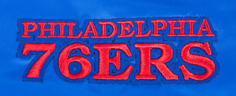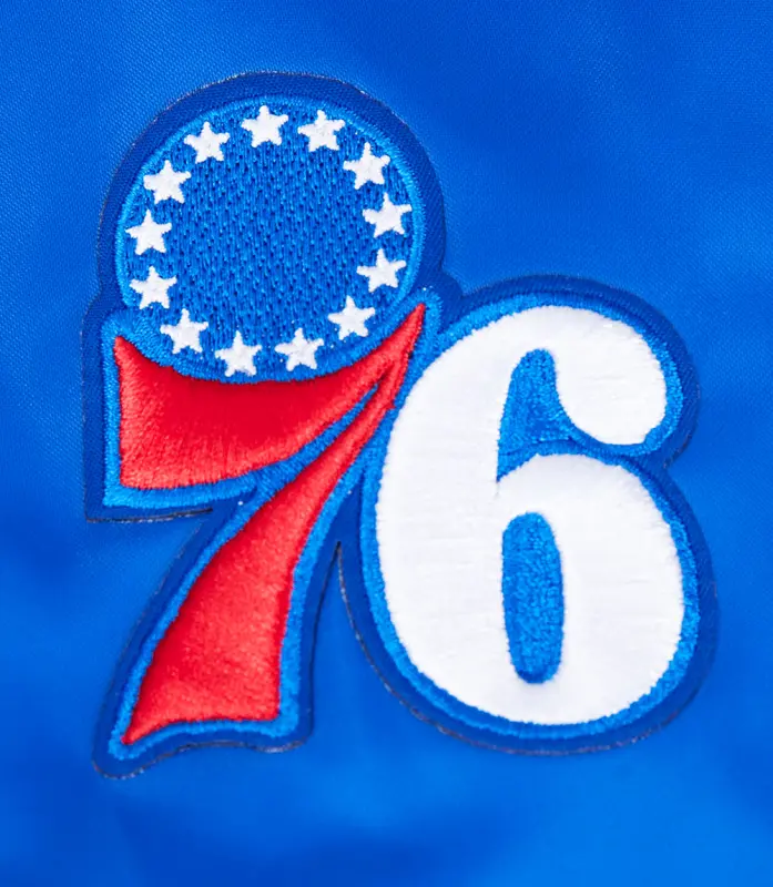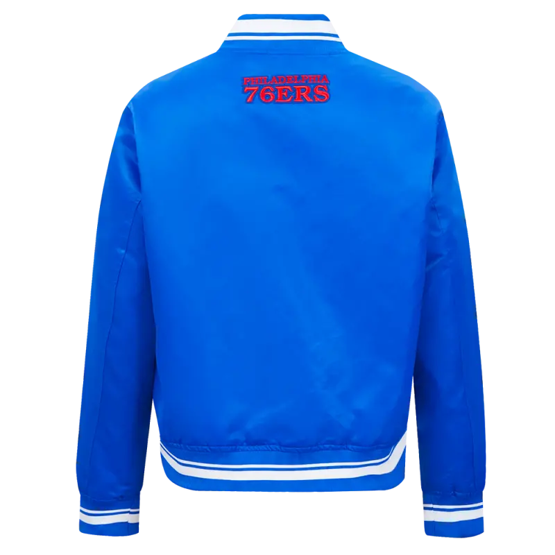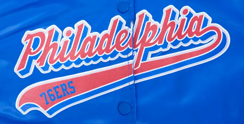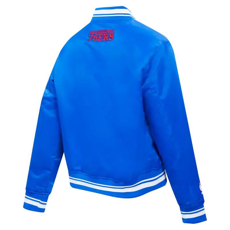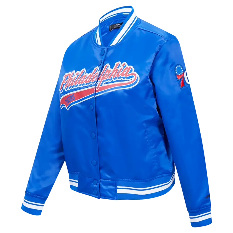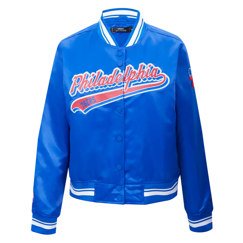 NBA PHILADELPHIA 76ers SCRIPT TAIL WOMEN’S SATIN JACKET (ROYAL BLUE)