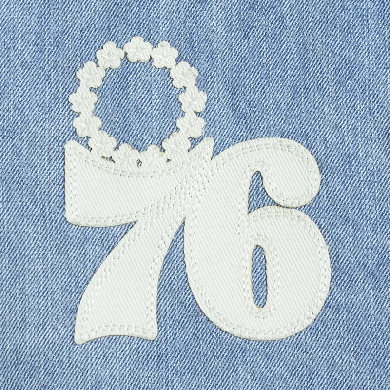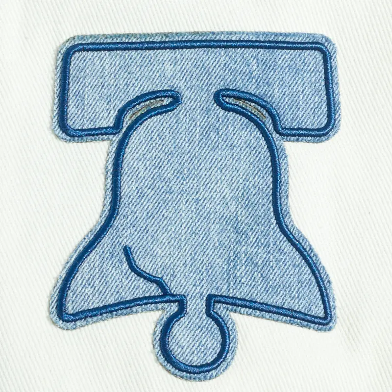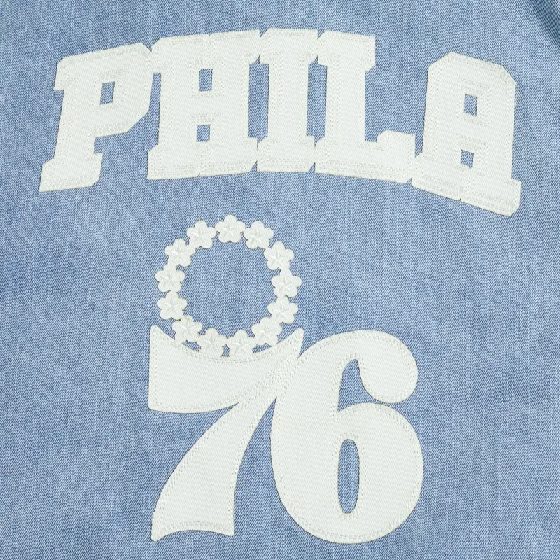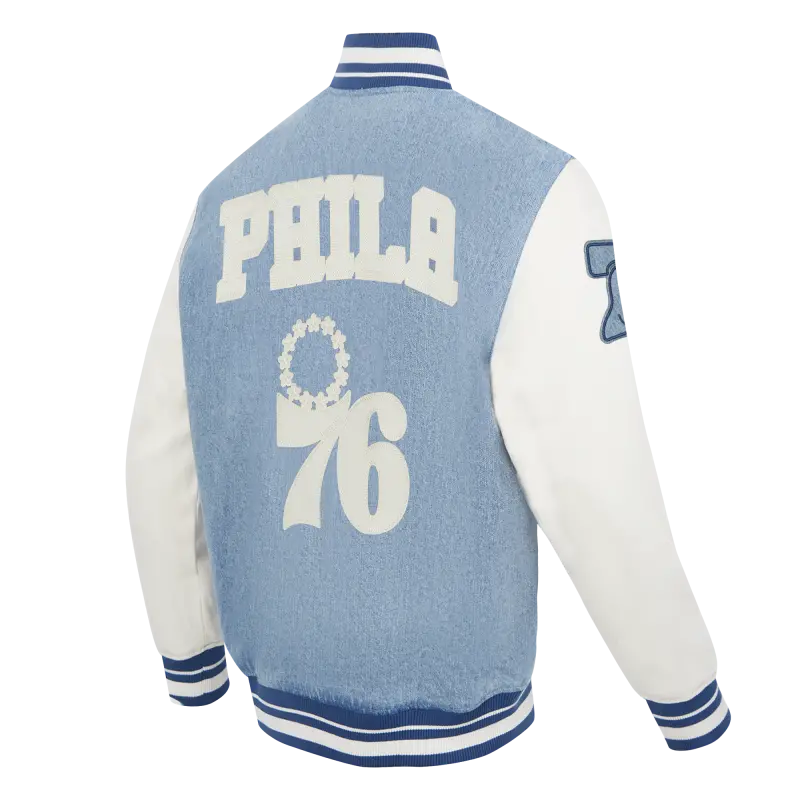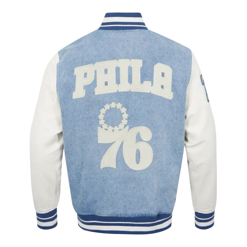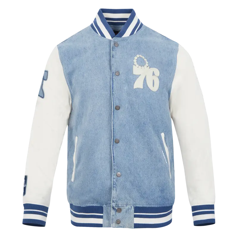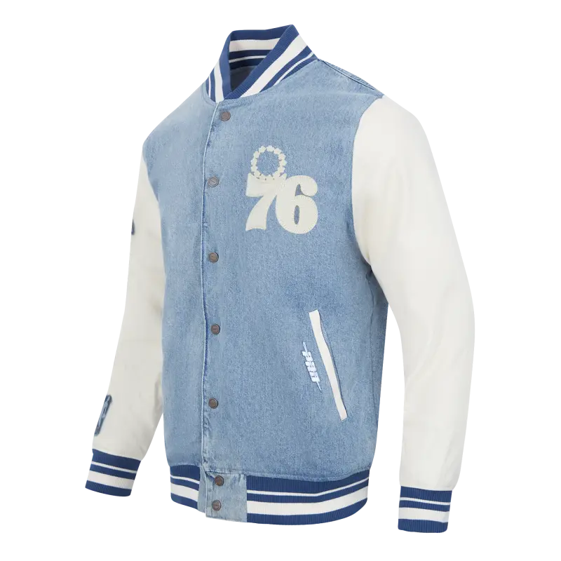 NBA PHILADELPHIA 76ERS VARSITY BLUES MEN’S DENIM VARSITY JACKET (DENIM\/LINEN)