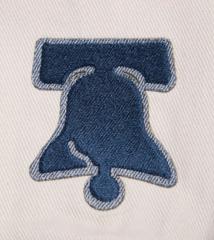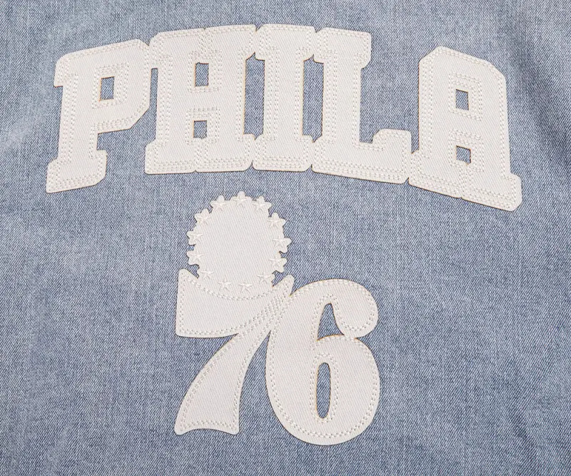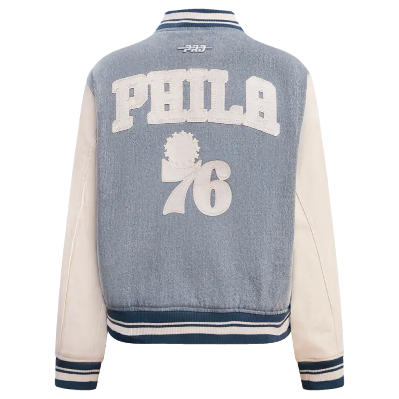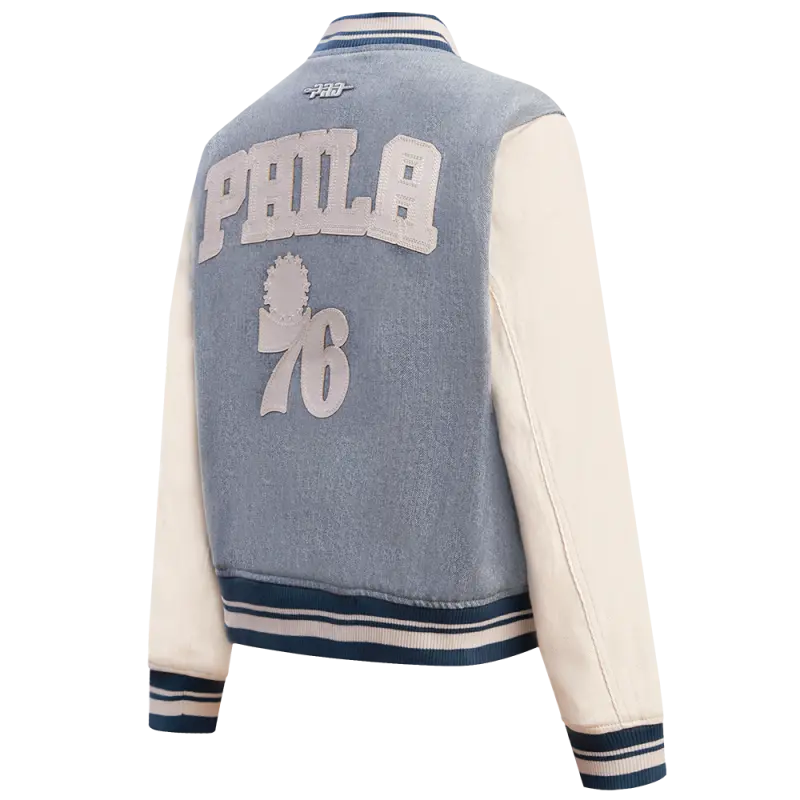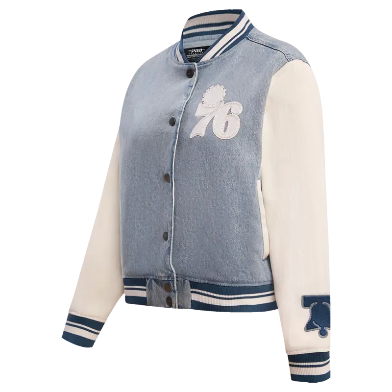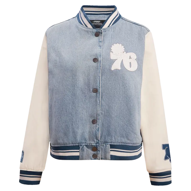 NBA PHILADELPHIA 76ERS VARSITY BLUES WOMEN’S DENIM VARSITY JACKET (DENIM\/LINEN)